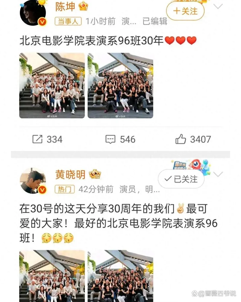陈坤和黄晓明发了北京电影学院表演系96班的合影,这是他们毕业30周年后一次难得的重聚。北影表演系96班响当当,他们班有赵薇、颜丹晨、祖峰等演员,连靳东老婆李佳也是这个班的。30年了,他们虽然都不年轻了,但是他们的容颜几乎没变。