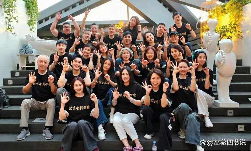 96班的同学们一起穿了写着北京电影学院的黑色文化衫一起合影,30年后他们坐在一起追忆往昔,身边都是自己熟悉的同学,这样的聚会很感人。他们一起比着数字“30”合影,三十年一晃就过去了,大家还能聚在一起真的挺难得的。