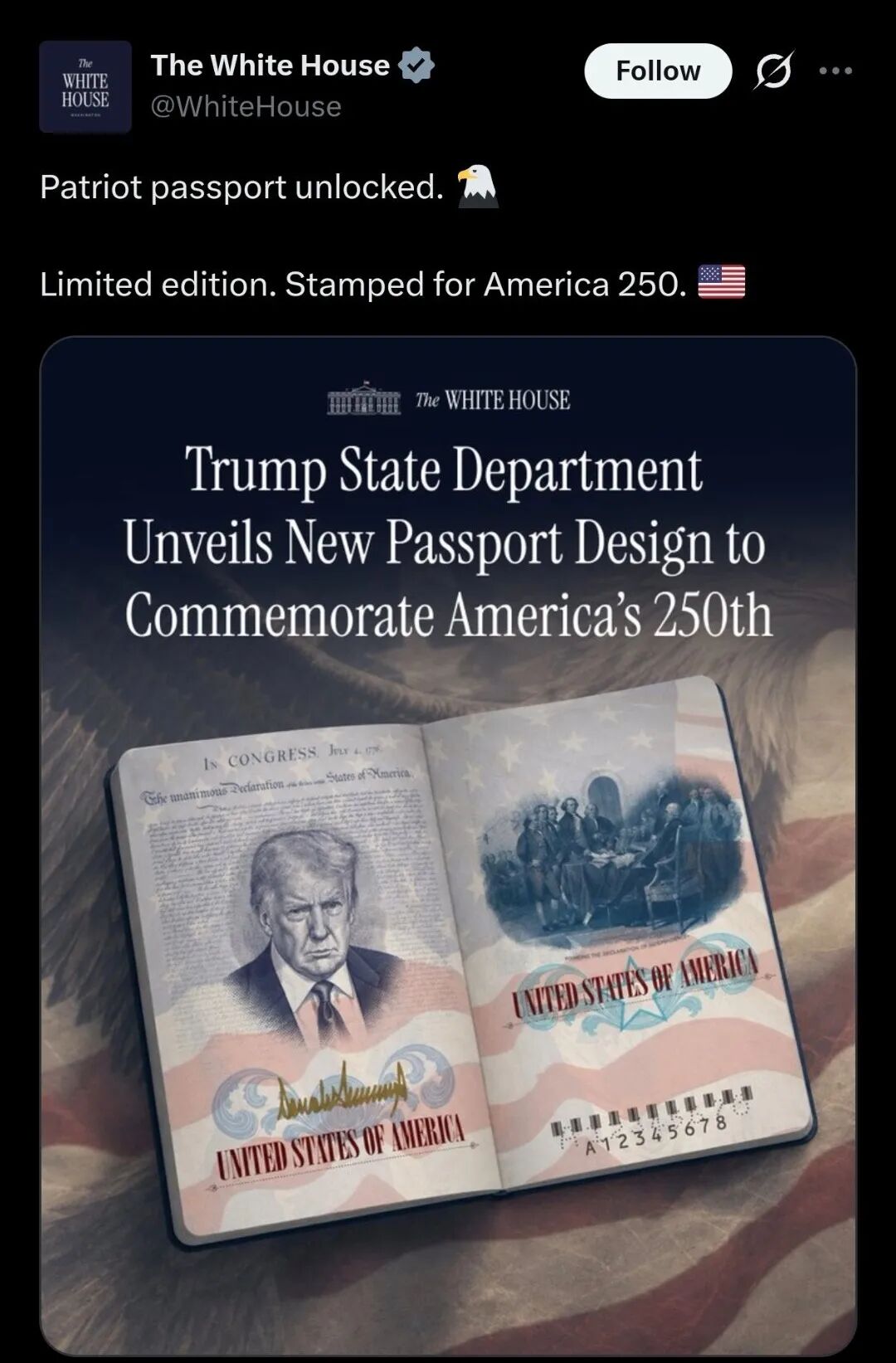 印有特朗普肖像的护照。白宫社交媒体截图