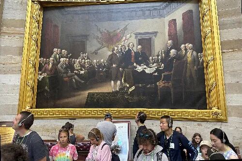 美国国会大厦悬挂的《独立宣言》油画。(照片:美联社)美国驻华大使馆官方微博发