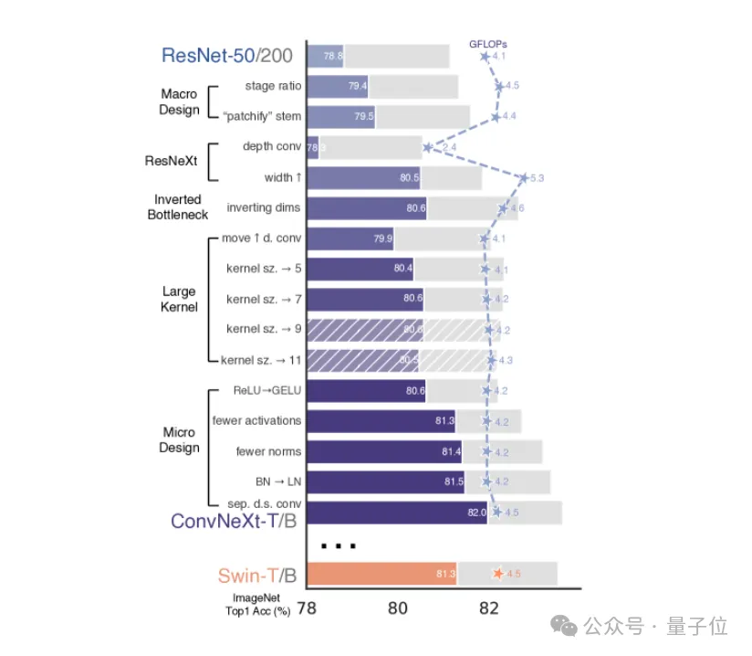 △ConvNeXt论文的Figure 2,展示了ResNet现代化的完整过程和每一步对应的性能变化