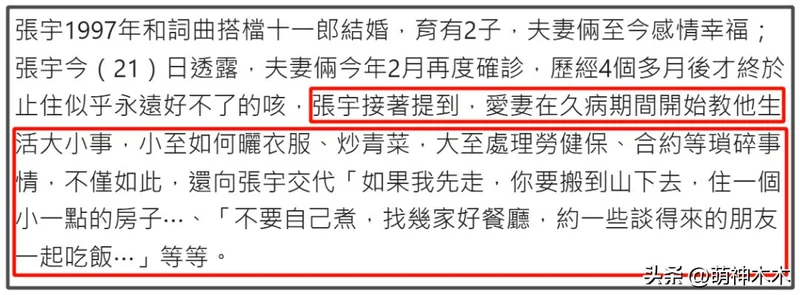 从十一郎的发文就能看出她对张宇的深爱,25年的时候,十一郎生病,觉得自己状态不好,开始教张宇处理生活琐事,从如何晒衣服到如何做饭,再到处理保险、合约。