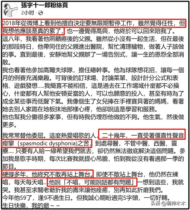 在张宇59岁生日这天,张宇的妻子十一郎发文为他庆生,并随之透露了他停工8年的原因,直言宁愿自己折寿也希望他能痊愈。