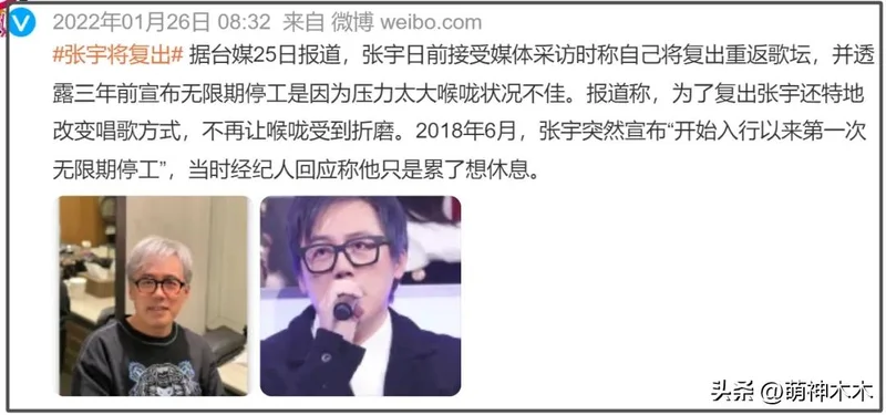 此后几年,张宇硬撑着也参加了不少节目,开演唱会,但在2018年,张宇没提前商量,擅自决定要无限期暂停工作。后来也传出张宇要复出的消息,台媒还爆料称张宇为了复出改变唱歌方式。但后来张宇只是去音综当了评委。