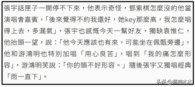 甚至还提起之前因为一起参加《歌手》而结缘的邓紫棋,张宇还戏称邓紫棋为“儿媳妇”,抱怨游鸿明的演唱会和邓紫棋撞档期,“害我没办法去大巨蛋听我儿媳妇唱歌”。当晚老友齐聚游鸿明演唱会,张宇还怀念了小胖袁惟仁,感慨独缺他一人。
