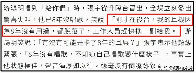 终于在26年4月份的时候,张宇重新站上舞台,为好友游鸿明的演唱会担任嘉宾。张宇自己心态倒是很稳,离开舞台8年,虽然有紧张,但依旧是老样子,出来就自曝糗事,说自己的耳机因为8年没有用过,都脱落了,还是后台工作人员紧急给他换了一副。
