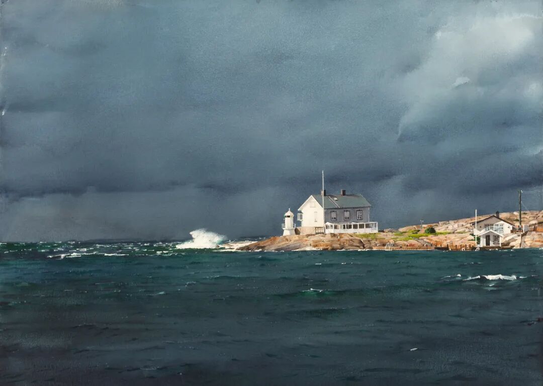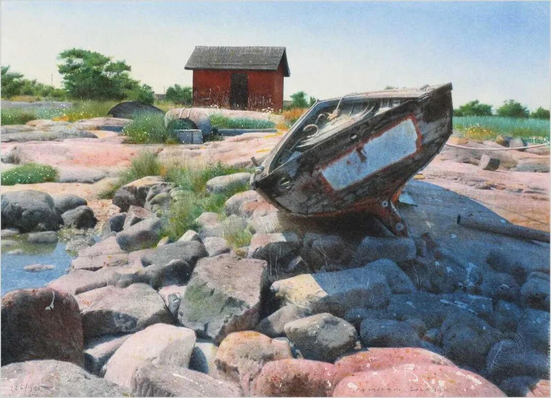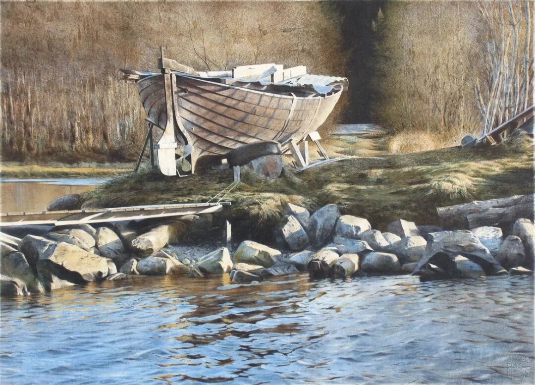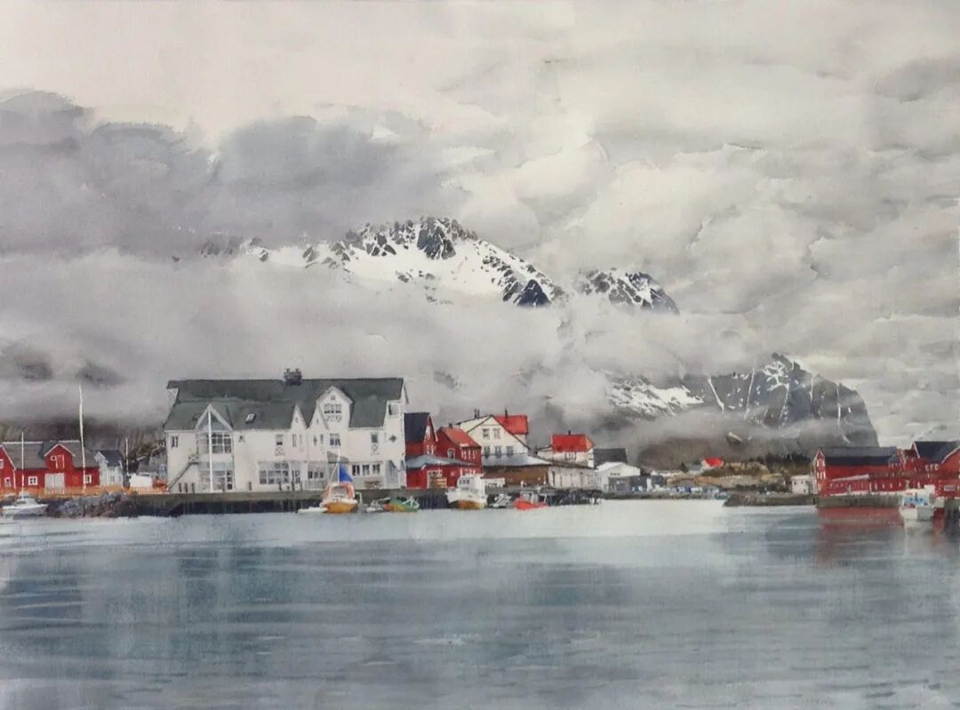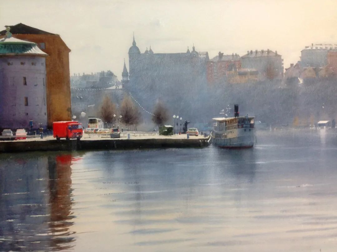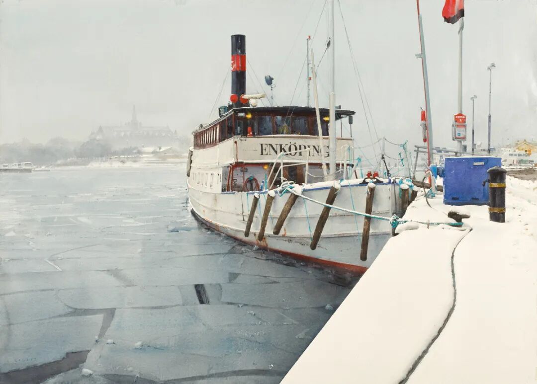 在他的画里,水是光的容器,光是画的灵魂。他极少使用白色颜料,仅靠精准的留白与冷暖色彩对比,就勾勒出北欧特有的清冷天光、水面粼粼波光,还有薄冰下通透的光影折射。