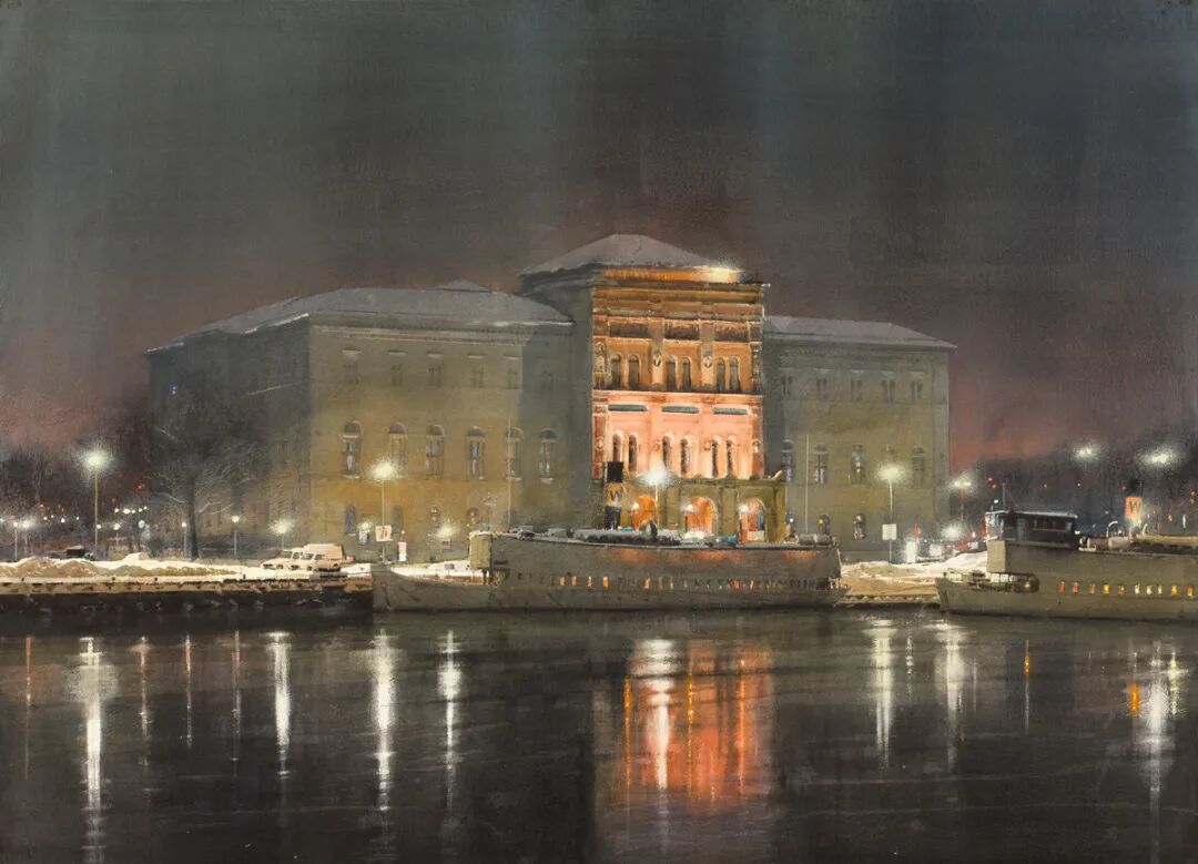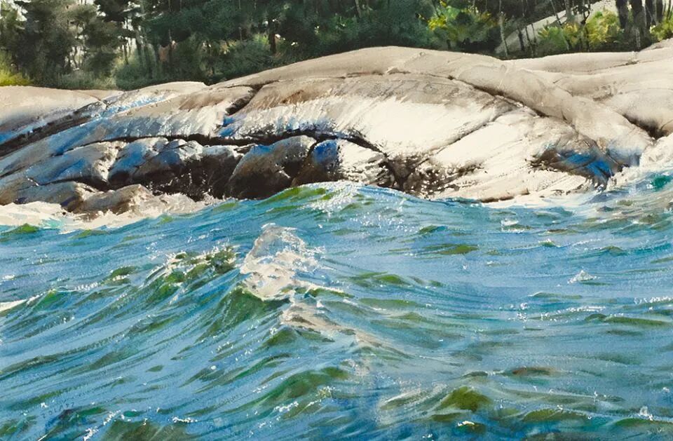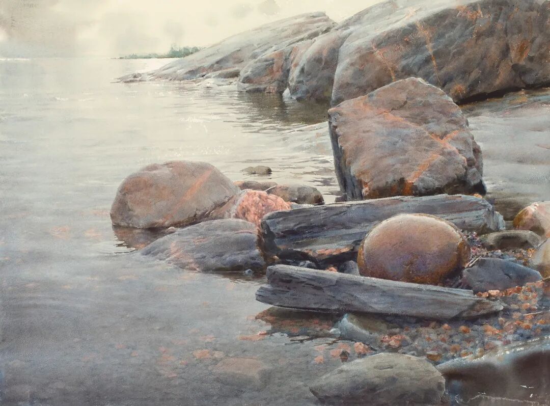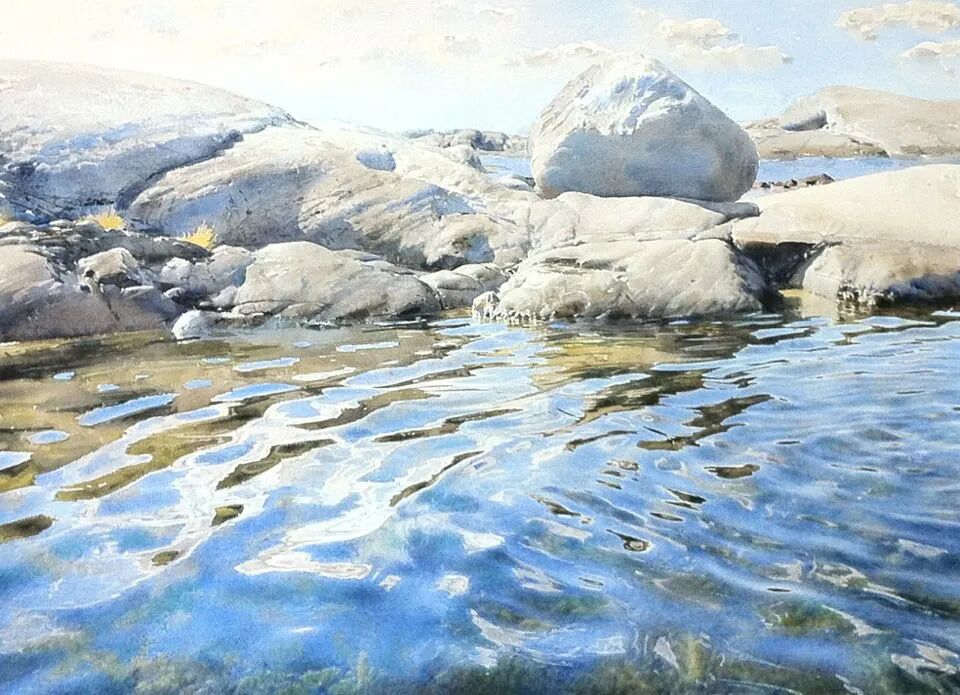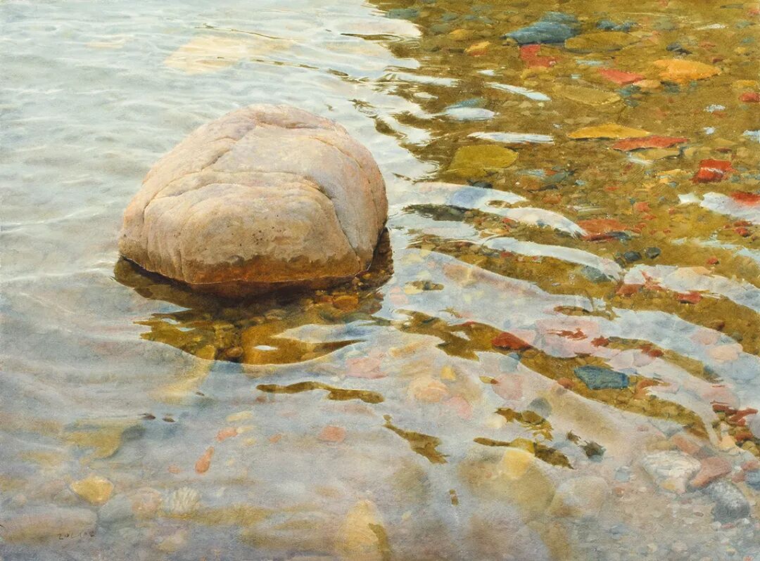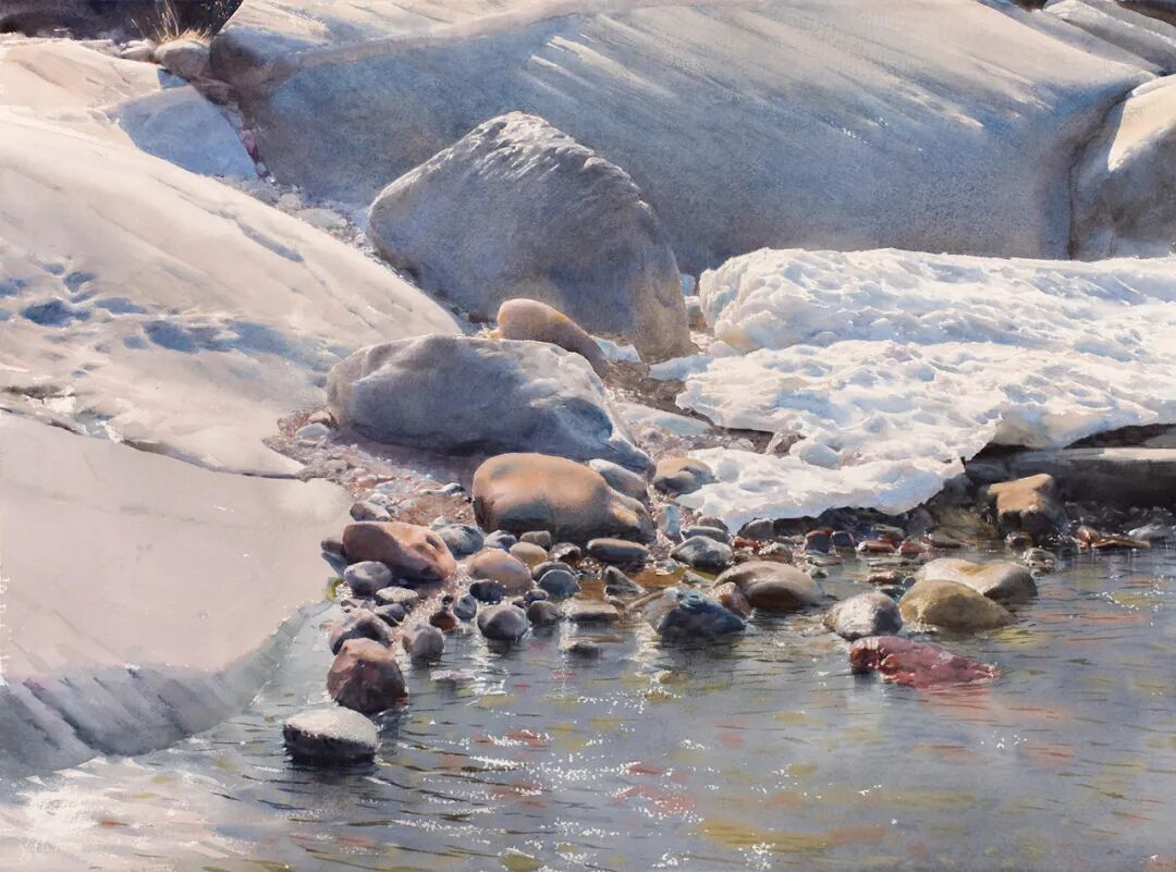在他的画里,水是光的容器,光是画的灵魂。他极少使用白色颜料,仅靠精准的留白与冷暖色彩对比,就勾勒出北欧特有的清冷天光、水面粼粼波光,还有薄冰下通透的光影折射。