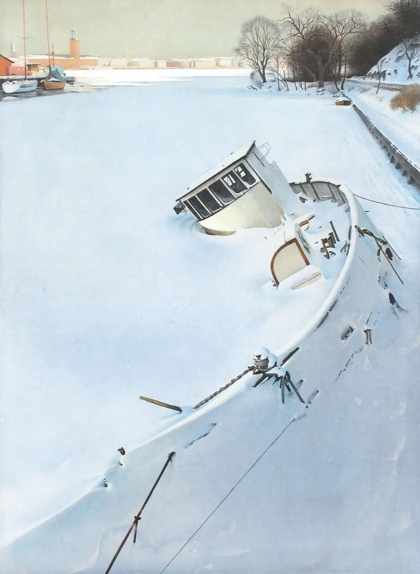 “光才是画面的主角,而非岩石、船只或积雪。” 这是佐拉兹贯穿一生的艺术信念。在他的画里,水是光的容器,光是画的灵魂。他极少使用白色颜料,仅靠精准的留白与冷暖色彩对比,就勾勒出北欧特有的清冷天光、水面粼粼波光,还有薄冰下通透的光影折射。