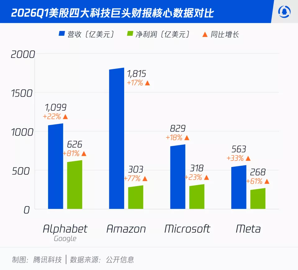 谷歌母公司Alphabet营收达到1099亿美元,每股收益5.11美元,远超华尔街预期的2.62美元;亚马逊净销售额1815亿美元,净利润303亿美元,每股收益2.78美元,几乎是预期的两倍;微软营收829亿美元,同比增长18%;Meta净利润268亿美元,同比接近翻倍。