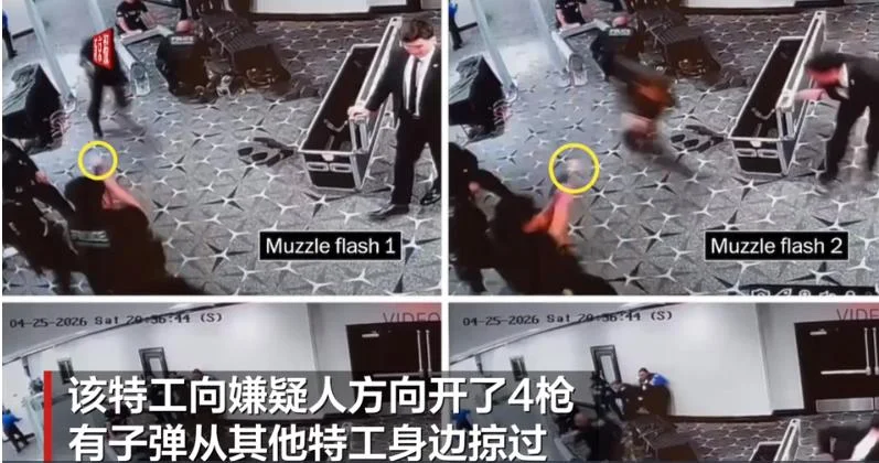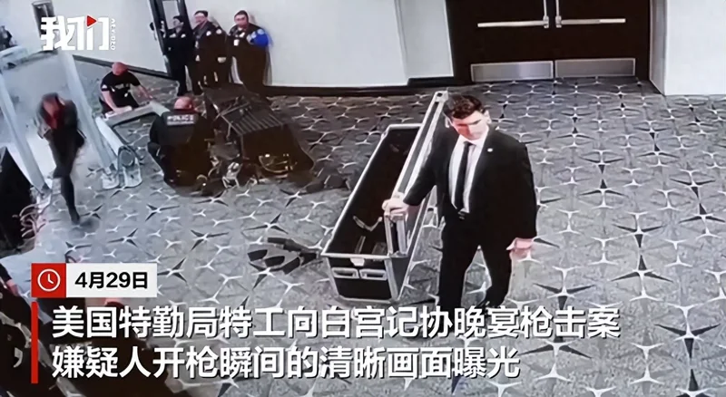 4月29日,美国特勤局特工向白宫记协晚宴枪击案嫌疑人开枪瞬间的清晰画面曝光。 画面清晰展示嫌疑人全速冲出门到跌倒在通往宴会厅楼梯顶部的经过,全程4秒。画面显示,嫌疑人似乎曾将霰弹枪抬起对准一名特工,该特工2秒内掏出枪向嫌疑人方向开了4枪,有子弹从其他特工身边掠过。 报道称画面没有显示嫌疑人曾开枪,嫌疑人所持霰弹枪枪口也未见明显火光。