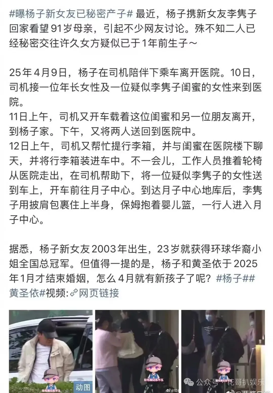 2025年4月12日,杨子身边的司机曾亲自驾车,将李隽子从医院接出,随后径直送往高端月子中心。月子中心地下车库的监控画面被曝光,画面里随行保姆手提婴儿篮,一行人浩浩荡荡的身影,足以证实当时李隽子刚生产完毕,正处于产后休养阶段。结合生产时间倒推,李隽子的怀孕时间大致在2024年6月前后。