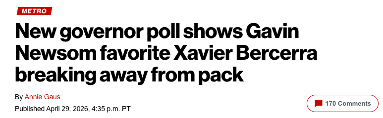 该民调于4月21日至26日期间对1000名潜在选民进行调查。结果显示,共和党候选人查德·比安科(Chad Bianco)与民主党亿万富翁汤姆·斯泰尔(Tom Steyer)各获得14%支持率;民主党人凯蒂·波特(Katie Porter)与马特·马汉(Matt Mahan)分别获得8%与7%的支持。