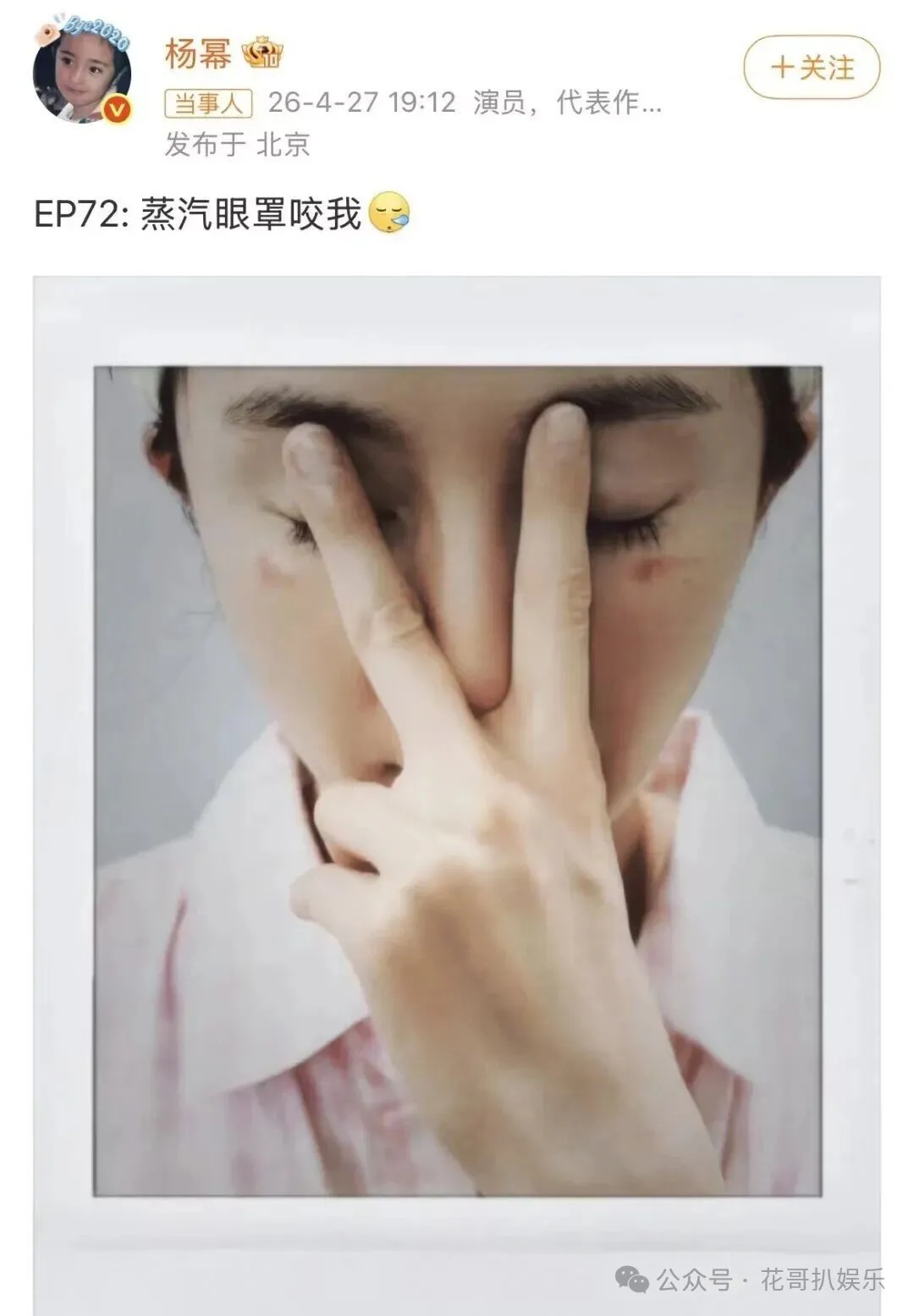 看来明星有时候也会买到假冒伪劣的产品啊。近日杨幂一张随手分享的自拍,说自己不小心被蒸汽眼罩烫伤了,照片能看到她眼周部位有着十分明显的泛红伤痕,显然是被蒸汽眼罩低温烫伤了,看样子伤得还不轻。