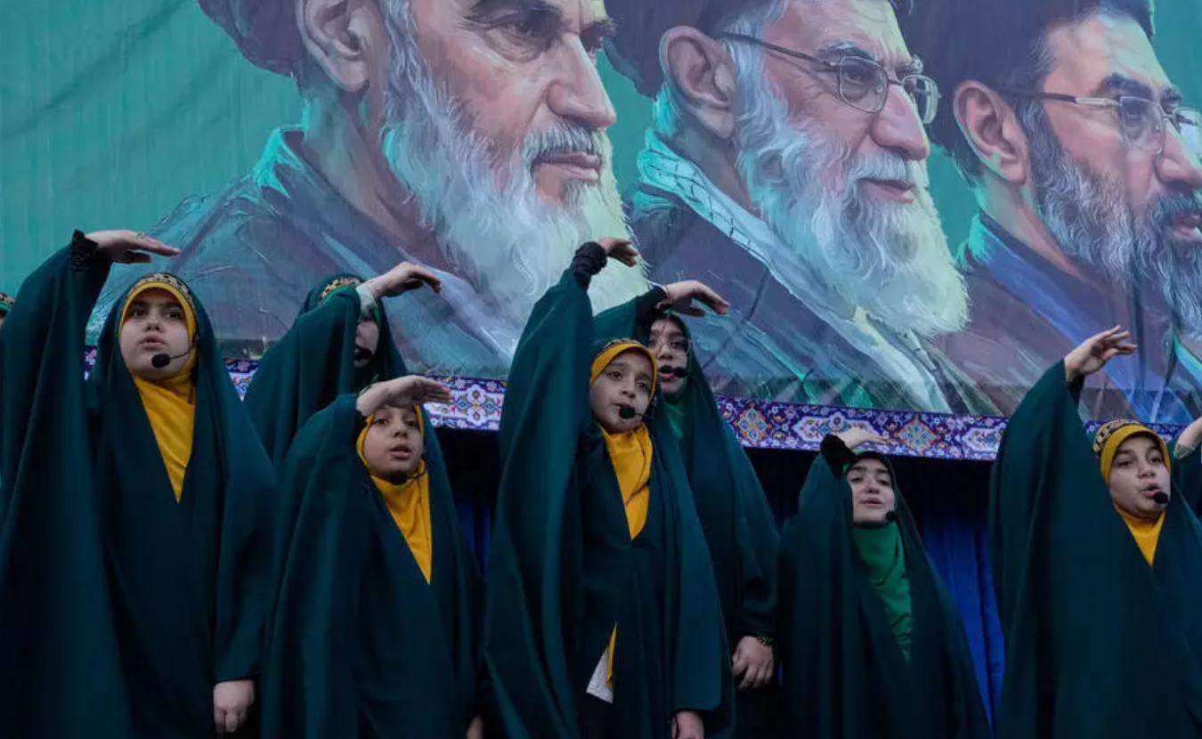 2026年4月29日,星期三,在德黑兰,一群女孩在已故伊朗革命创始人霍梅尼(左)、已故最高领袖阿里·哈梅内伊(中)和最高领袖穆杰塔巴·哈梅内伊的画像旁唱歌,并用手比划着导弹的飞行轨迹。这是一场由政府组织的集会,旨在庆祝第八位什叶派穆斯林伊玛目礼萨的诞辰,并支持最高领袖。(美联社照片/瓦希德·萨莱米) AP - Vahid Salemi