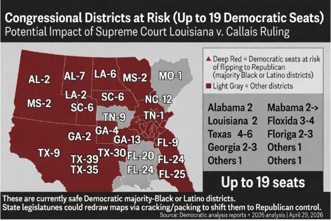 分析指出,在最极端情境下,共和党可能透过“裂解(cracking)”与“填塞(packing)”策略,将少数族裔选民分散或集中重组选区结构,使民主党在南方传统优势选区大幅缩水,潜在影响席次可达数十席规模。
