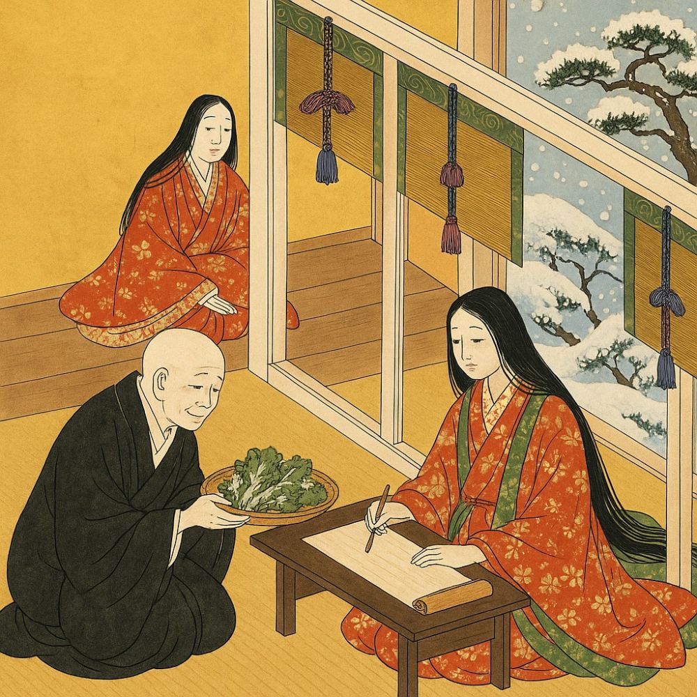 第五十三回“习字”:神奇的事情发生了,宇治院树根发现一个羸弱濒死的女子,却是人们认为已经投河自尽的浮舟。遇到僧都及妹尼僧倾力救助,她得以慢慢恢复,开始习字,诵经,学习赋诗作辞,然而悲痛厌世之心毫不稍减,如愿落发为尼。有个人来,送些嫩菜给妹尼僧。妹尼僧以此转赠浮舟,附一诗曰:“山乡新菜嫩,带雪摘来初。愿汝长安乐,青青似此蔬。”浮舟答诗曰:“山野深深雪,新蔬寂寂青。从今延岁月,只为慰君情。” 妹尼僧激动不已,竟然热泪盈眶。